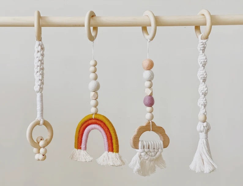 This natural macrame gym accessories bring a joy to your baby’s face. Before a mobile, Babies still take all sights and sounds. These toys are perfect for exploring and sensory development through the different textures and colors.